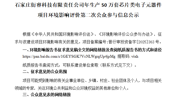 了解详情根据《中华人民共和国环境影响评价法》、《环境影响评价公众参与办法》,征求与该建设项目环境影响有关的意见。项目备案编号:晋行审投资备字[2025]363号。一、环境影响报告书征求意见稿全文的网络链接及查阅纸质报告书的方式和途径https://pan.baidu.com/s/1GEYSGK7VcNLWg