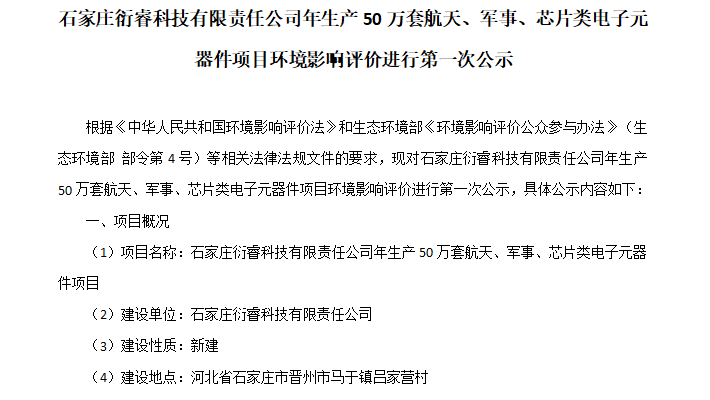 了解详情根据《中华人民共和国环境影响评价法》和生态环境部《环境影响评价公众参与办法》(生态环境部 部令第4号)等相关法律法规文件的要求,现对石家庄衍睿科技有限责任公司年生产50万套航天、军事、芯片类电子元器件项目环境影响评价进行次公示,具体公示内容如下:一、项目概况(1)项目名称:石家庄衍睿科技有限责任公司